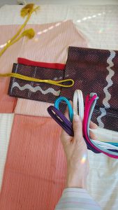 実際に着物と帯を平置きして小物を合わせて配色を実践していきます。
